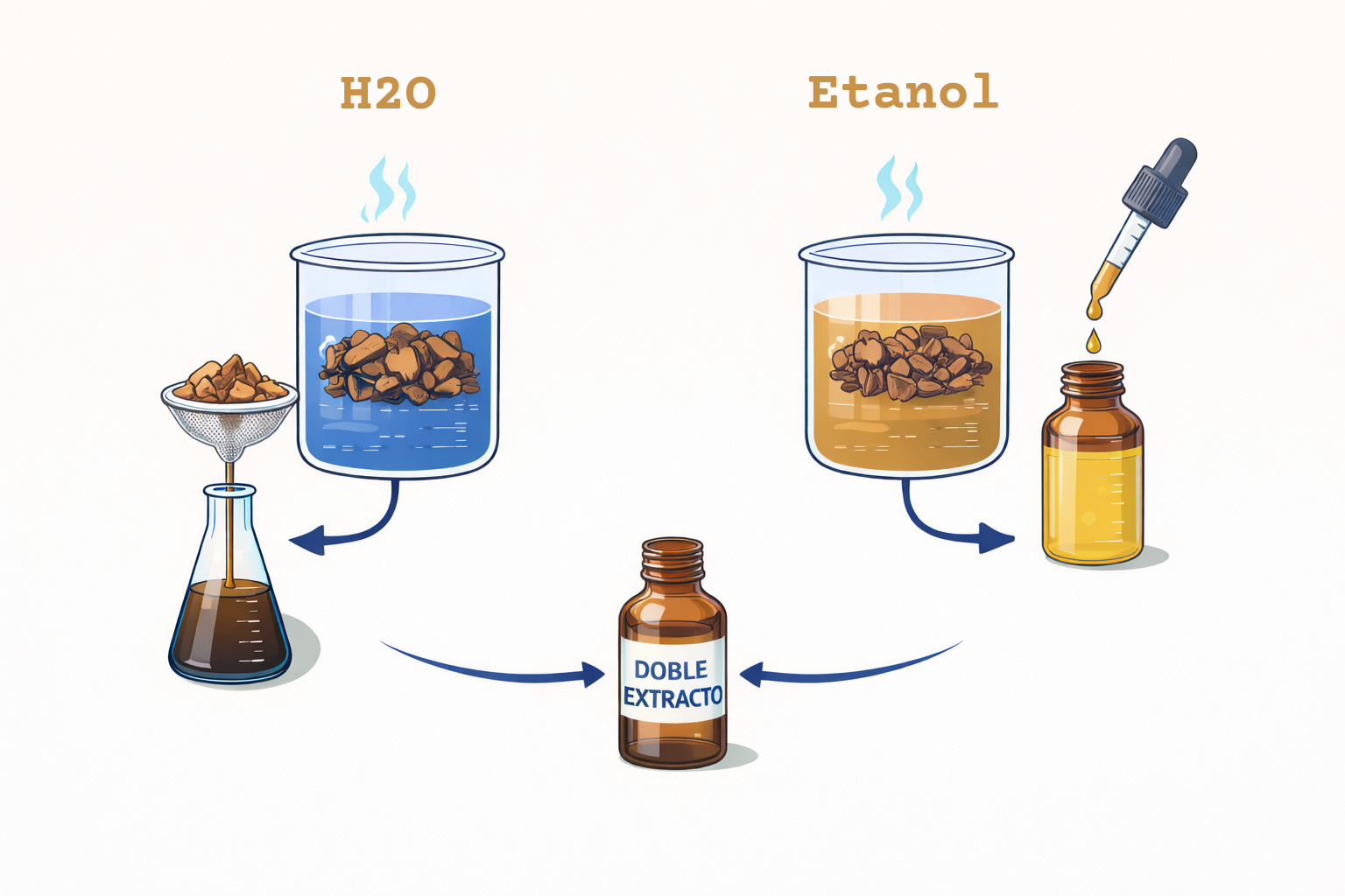 La doble extracció, també coneguda com a extracció doble o hidroalcohòlica, combina tots dos mètodes en un procés seqüencial que captura tant els compostos hidrosolubles com els liposolubles. Aquest és el mètode que fem servir a Boscum per garantir que els nostres extractes contenen l'espectre més complet possible de principis actius.